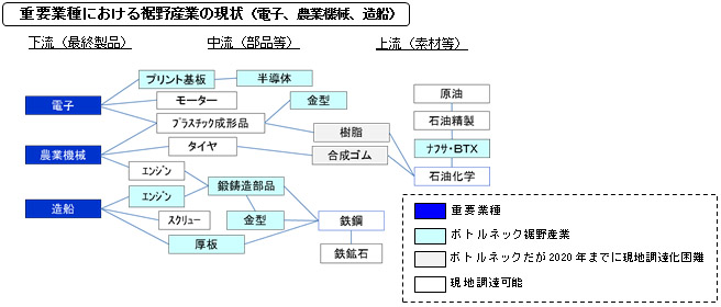 また、ベトナムでは2011年から2020年の社会経済開発10カ年計画において「2020年までに工業国化を達成する。」ことを全体目標としており、工業国化のために特に重要な業種として、①電子産業、②農業機械、③造船、④自動車、⑤農水産品加工、⑥環境(省エネルギー・機器等)の6つの業種を掲げています。しかしながら、これらの業種についても生産上ボトルネックとなる裾野産業が存在しており、全体目標を達成するうえでもやはり裾野産業の発展が不可欠なものとなっています。