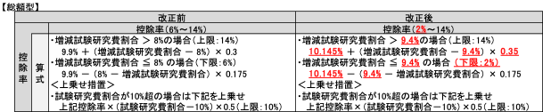 研究開発投資の増加インセンティブを強化するため、控除率カーブが見直され、総額型の控除率の下限が2%(現行:6%)に引き下げられ、上限を14%(原則10%)とする特例の適用期限を2年延長する。