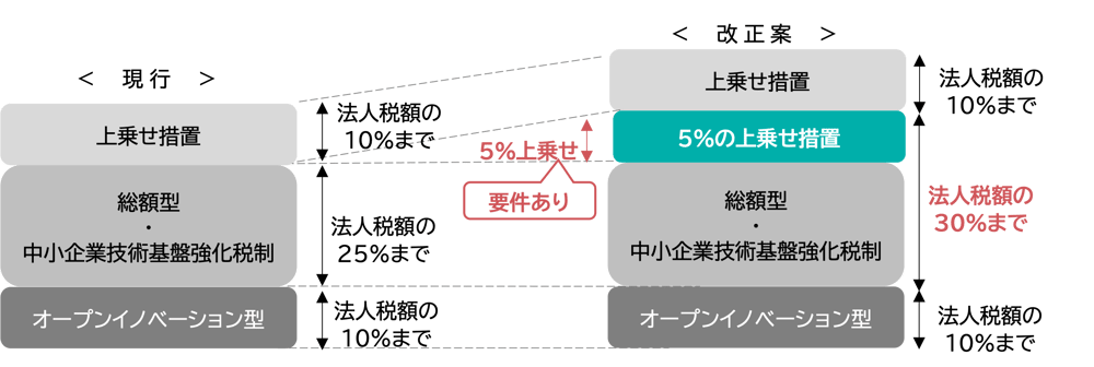 コロナ禍の厳しい経営環境であっても研究開発投資の増加を促すため、一定の要件のもと、総額型及び中小企業技術基盤強化税制の税額控除額の上限が5%上乗せされる。
