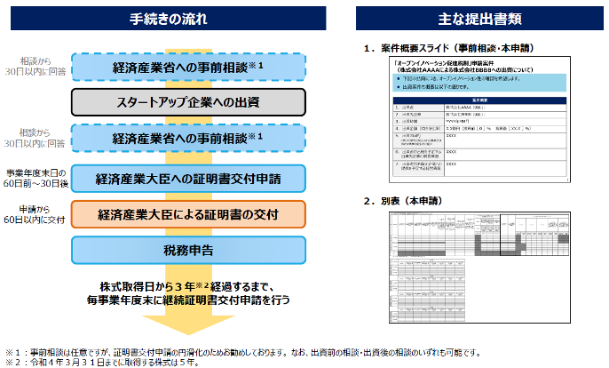 オープンイノベーション促進税制の適用にあたっては、経済産業大臣による証明書の交付を受ける必要がある。交付申請手続きは事業年度末日の60日前~30日後に行うことができるが証明書の交付まで最長60日を要し、かつ、法人税申告書に証明書の添付が必要となることから早めに対応することが望ましい。