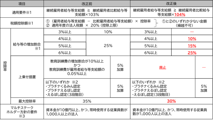 ③ 中堅企業向け、中小企業向けにおける教育訓練費に係る上乗せ措置を廃止する。