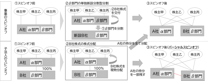 スピンオフは、単独新設分割型分割による「事業のスピンオフ」と、株式分配による「子法人のスピンオフ」(※)に分類され、「子法人のスピンオフ」のうち、親法人に子法人の発行済株式の一部を残して行うスピンオフを「パーシャルスピンオフ」という。