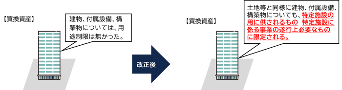 長期所有(10年超)の土地、建物等から国内の土地、建物等への買換えについて、買換資産のうち、建物及びその付属設備を特定施設(※)の用に供される建物及びその付属設備に、構築物を特定施設に係る事業の遂行上必要なものに、それぞれ限定されるため注意が必要である。