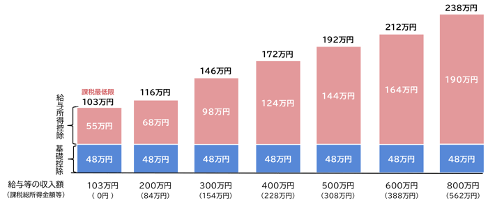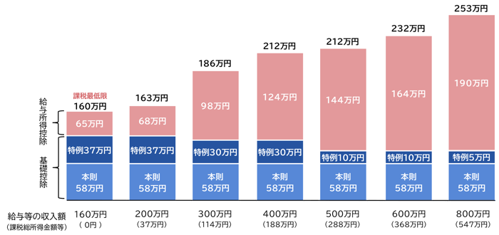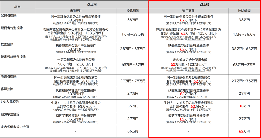 - 配偶者(特別)控除や扶養控除等の判定基準となる合計所得金額等もそれぞれ4万円引上がる。