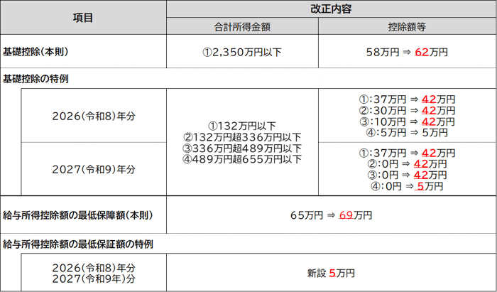② ①に加え、2026(令和8)年・2027(令和9)年の時限措置として、中低所得者(合計所得金額が489万円以下)を対象に「基礎控除の特例」が42万円まで引上げられ、また、給与所得控除額の最低保障額も5万円引上げられる。