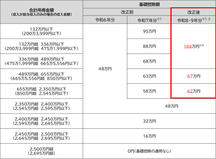 - 中所得者(年収665万円以下)についても「基礎控除」を104万円まで引き上げ(48万円※1から56万円増)