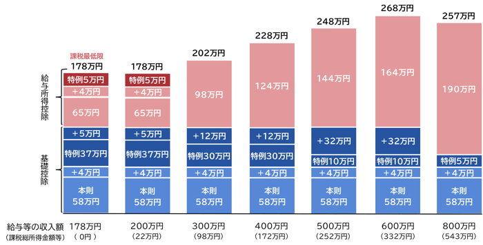 基礎控除が定額の場合、物価が上昇すると控除の実質的な価値が減少し、結果として実質的な税負担が増加する。こうした課題に対応するため、消費者物価指数(総合)に連動して基礎控除を引き上げる仕組みが創設され、併せて給与所得控除の最低保障額についても同様の措置が講じられる。 今般の改正により、「基礎控除」及び「給与所得控除の最低保障額」は、それぞれ4万円引き上げられる。
