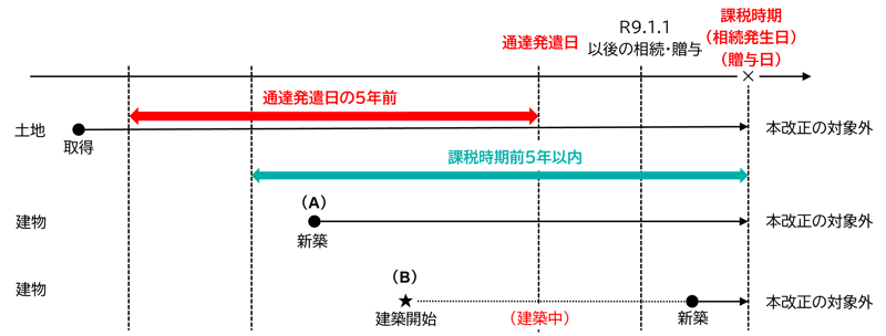 【経過措置】通達発遣日の5年前から所有している土地の上に、本通達の発遣日前に新築した貸付用建物(A)、又は、本通達の発遣日に建築中の賃貸用建物(B)は本改正の対象外とする。