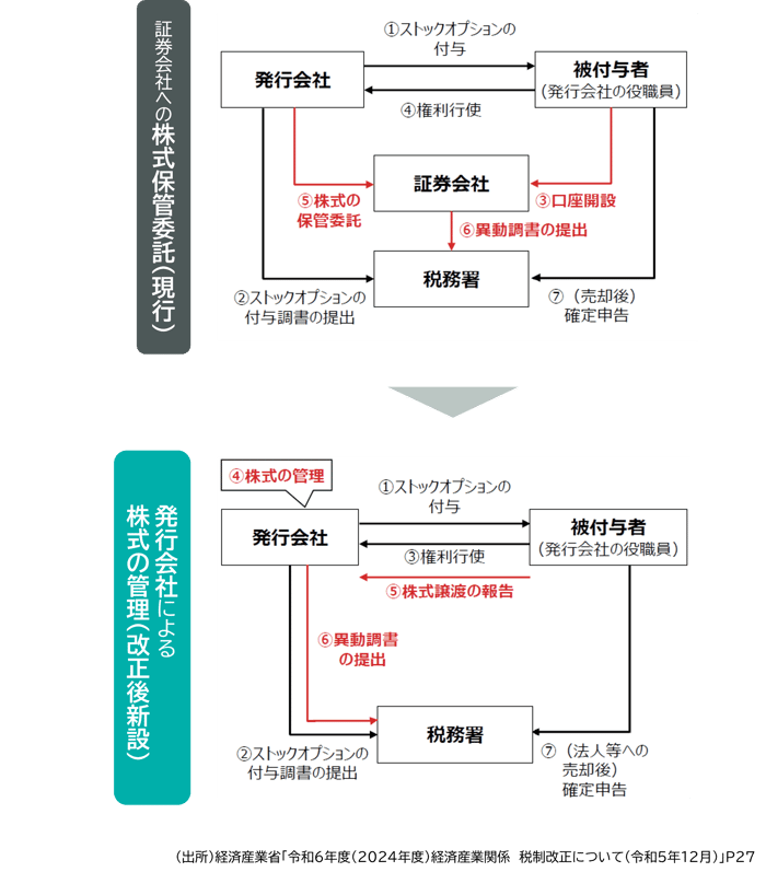 発行会社は、ストックオプションの行使により交付される株式について、帳簿を備え、権利者別に、株式の取得等異動状況を記載し、区分管理する必要がある。また、役職員等権利者や発行会社は、権利行使時や株式譲渡時において、必要な届出や管理を行っていくこととなる(措法29の2①六ロ、措令19の3⑨、措規11の3④、令和6年経済産業省告示第69号)。株式の管理を行う発行会社は、「特定株式等の異動状況に関する調書」を毎年1月31日までに所轄税務署長に提出しなければならない(措法29の2⑦、措令19の3㉗㉘、措規11の3⑰)。役職員等権利者が発行会社により管理されている株式を譲渡する場合、税制適格要件を満たすためには、証券会社等への売委託又は発行会社への譲渡が必要となる(措令19の3⑨(3))。