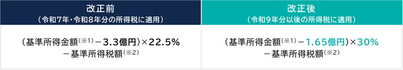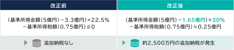 改正前は基準所得金額から3.3億円を控除し22.5%を乗じて追加税額を算定しますが、改正後は控除額が1.65億円に半減し税率も30%に引き上げられるため、追加税負担が増える仕組みに見直されています。
