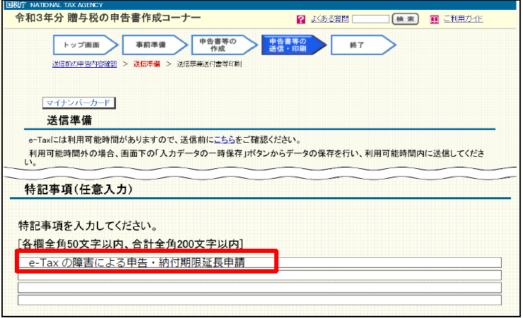 この場合、別途期限延長申請書の提出は不要で、申告書に「e-Taxの障害による申告・納付期限延長申請」である旨を記載するという簡易な方法で延長を申請することができます。