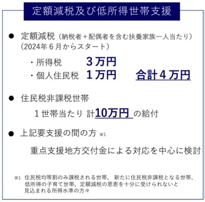 - 納税者及び扶養家族1人につき、令和6年分の所得税3万円、個人住民税1万円の減税