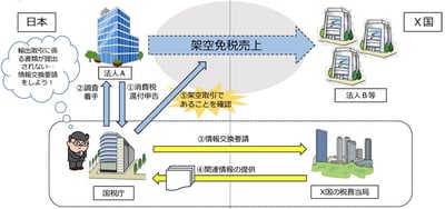 内国法人Aは、日本国内で日用雑貨品を仕入れ、X国の外国法人B等に輸出したとして、当該国内仕入に係る消費税に関して、還付申告書を提出していた。内国法人Aの調査においては、外国法人B等への輸出取引を証する資料が提出されなかったことから、当該取引の適否を検討するため、X国の税務当局に対して、内国法人Aとの取引を記帳した外国法人B等の会計帳簿等について情報提供の要請を実施した。