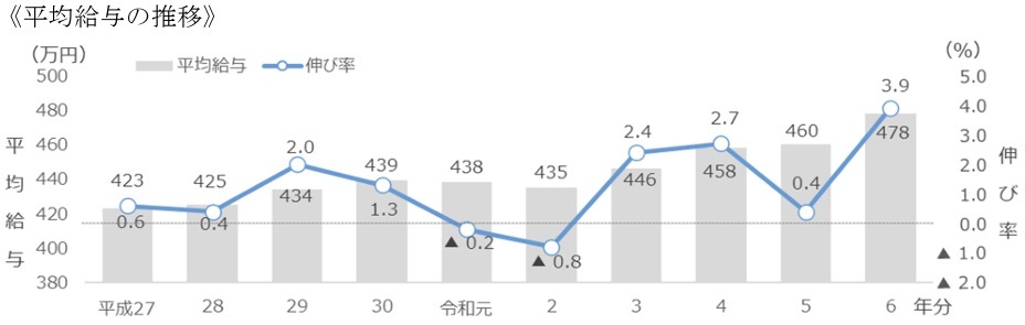 また、民間の給与所得者数は6,077万人。このうち、1年間を通じて勤務した正社員や派遣社員などの給与所得者は5,137万人で、その平均給与は478万円でした。これも前年と比べて3.9%の増加となり、日本の給与水準は全体的にアップ傾向にあることがうかがえます。