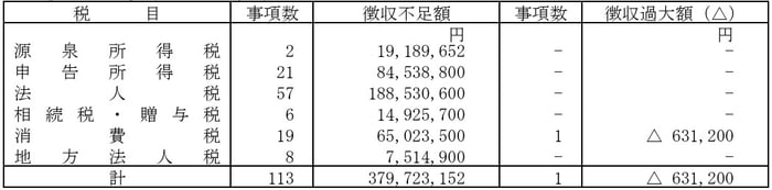 徴収の不足額を税目別にみると、最も多い法人税が57事項1億8,853万円、次いで申告所得税が21事項8,454万円、以下、消費税19事項6,502万円、源泉所得税2事項1,919万円、相続税・贈与税は6事項1,493万円となっています。