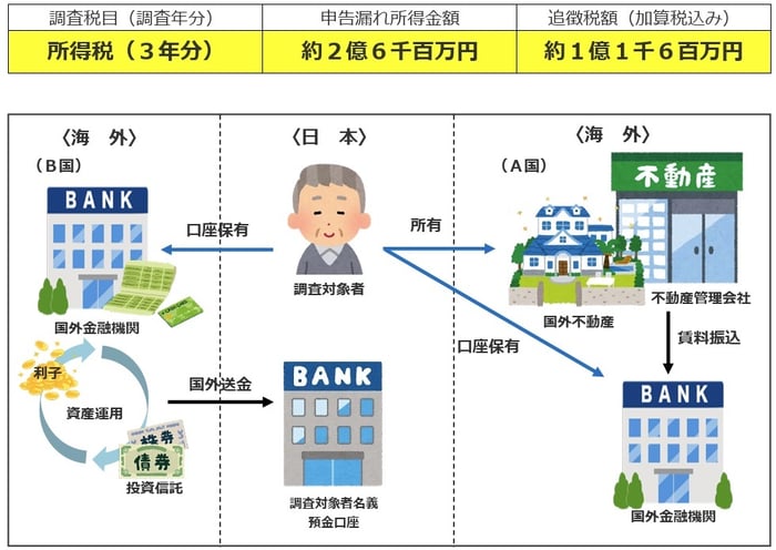 A国で賃貸中の不動産収入や、B国金融機関口座で受け取った投資信託収益・利子を申告していなかったケースが発覚し、課税処分が行われました。