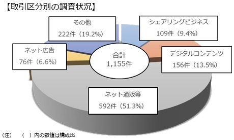 調査件数を取引区分別に見ると、ネット通販等592件 、デジタルコンテンツ156件、シェアリングビジネス109件、ネット広告76件、その他222件となっており、新しいビジネスモデルに関する調査を強化している様子がうかがえます。