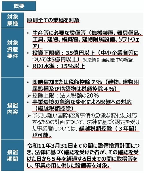 本制度の適用を受けるためには、令和11年3月末までに設備投資計画について産業競争力強化法に基づく確認を受け、 その確認日から5年を経過する日までに対象設備を取得し、事業の用に供する必要があります。