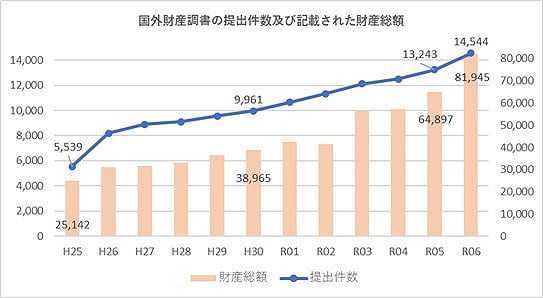 国税庁は「令和6年分国外財産調書の提出状況について」を公表しました。これによると、令和6年分の国外財産調書の提出件数は14,544件(前年比+9.8%)、財産総額は8兆1,945億円(同+26.3%)となり、いずれも前年を上回りました。