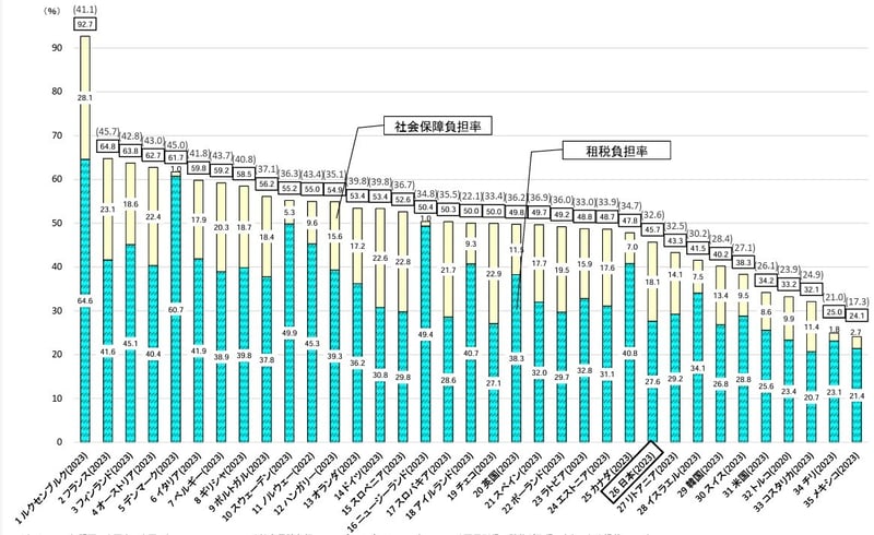 また、OECD加盟国のうち比較可能な35か国でみると(2023年実績)、最も高いのはルクセンブルクの92.7%、最も低いのはメキシコの24.1%で、日本は26番目とされています(※この順位は2023年実績に基づく比較)。